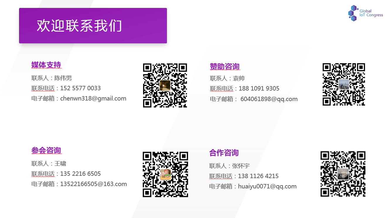 全球物联网大会主席、中关村物联网产业联盟秘书长王正伟先生表示:“全球物联网大会”更关注行业新技术、新观点、新趋势、新看法,愿意为行业内的创新者提供展示自己的平台以及拓展商业的机会。全球物联网大会至今已成功举办2019、2018、2017三届,全面走访了包括日本、芬兰、英 国、新加坡、韩国、西班牙、法国、比利时、荷兰、德国等国家,并先后与20多个国家和地区的近千家物联网企业 进行了广泛的对接交流。同时还在大中华地区的10多个省24个区域举办了系列化物联网推广活动,与当地政府、组织和企业进行了深入合作。“全球物联网大会”将会成为物联网行业的风向标,无论你是行业巨头、高精尖 企业,还是小型创新企业,或者来自政府机关、投资机构,”全球物联网大会“都将 为您带来与众不同的行业体验:专业技术更新、市场信息发布、大量项目对接。在此,我谨代表组委会全体工作人员,感谢您的光临和见证,也感谢您对大会以及中关村物联网产业联盟长期以来的支持和帮助。我们相信,全球互联的盛会,将给您留下难忘的回忆。